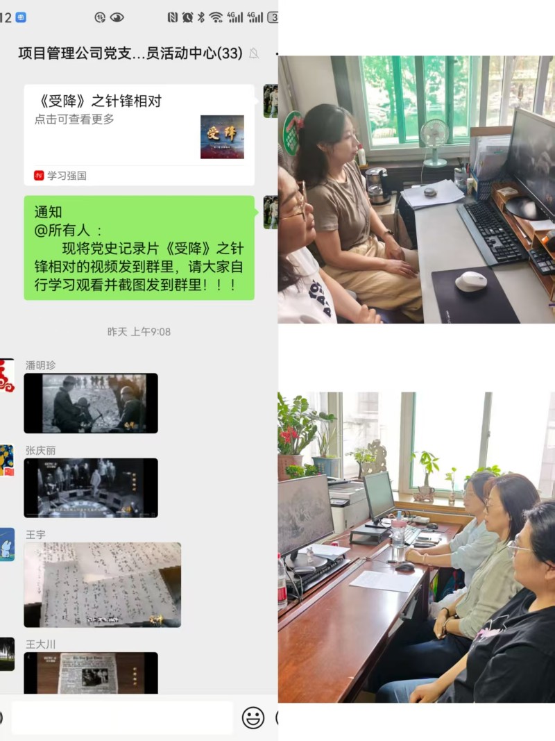 9月1日,項目管理公司黨支部開展“重溫歷史 奮勇爭先”主題活動?;顒又校w黨員干部共同觀看黨史紀(jì)錄片《受降》,紀(jì)錄片以詳實(shí)的史料、珍貴的影像生動展現(xiàn)中國共產(chǎn)黨始終以人民利益為根本,在復(fù)雜形勢下堅守信仰、運(yùn)籌帷幄的政治智慧和使命擔(dān)當(dāng),引導(dǎo)黨員干部不斷加強(qiáng)黨史學(xué)習(xí),切實(shí)把優(yōu)秀歷史經(jīng)驗(yàn)轉(zhuǎn)化為推動工作的實(shí)際行動。