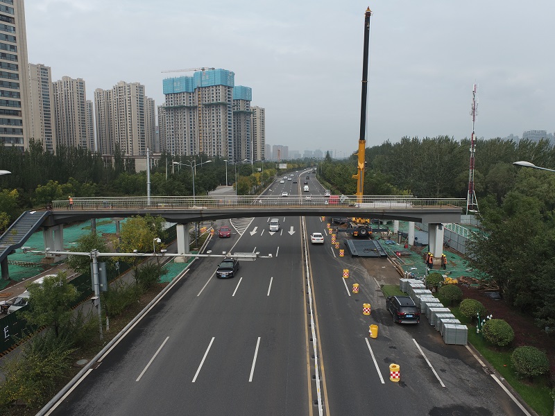 十項(xiàng)目部承建的北中環(huán)森林公園人行天橋主橋長度為93.8米,必須進(jìn)行分段吊裝。10月8日,項(xiàng)目部協(xié)調(diào)多臺500噸吊車進(jìn)場,在不影響車輛正常通行的情況下,利用夜間時間加緊進(jìn)行吊裝。同時,因時間緊,任務(wù)重,在灌注樁施工中,項(xiàng)目部全體參建人員精心配合、各司其職,人材機(jī)各方面緊密配合,確保按計(jì)劃時間節(jié)點(diǎn)完成每日工作量,為日后主橋吊裝作業(yè)節(jié)省出更多寶貴時間。截至目前,承建的三座人行天橋鋼箱梁主體結(jié)構(gòu)已全部完成。北中環(huán)森林公園南門人行天橋兩側(cè)欄桿安裝和主橋大理石鋪裝已完成,正在進(jìn)行南北兩側(cè)梯道坡道欄桿安裝和大理石鋪裝;濱河西路市圖書館北側(cè)人行天橋西側(cè)坡道吊裝已完成,下一步將進(jìn)行東側(cè)坡道吊裝、橋面鋪裝及護(hù)欄安裝;濱河西路三給街口人行天橋兩側(cè)梯坡道已吊裝完成,下一步將進(jìn)行梯坡道安裝和主橋大理石鋪裝。