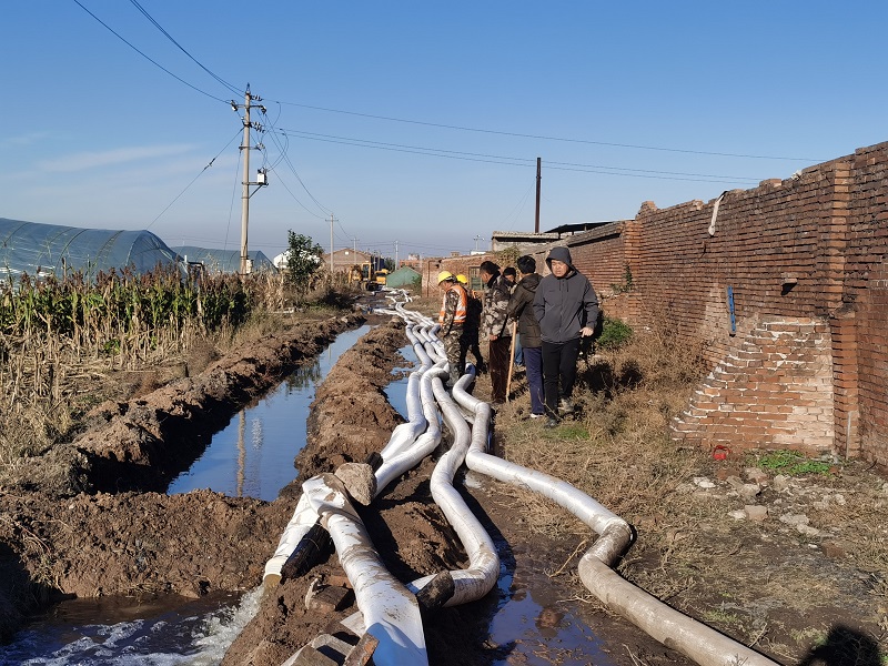 由于該村緊鄰象峪河,因河道水位持續(xù)高漲,村內(nèi)積水無法自然排出,導致近98萬平方米耕地被淹,總積水量約為60萬立方米。搶險突擊隊以里旺村小區(qū)西側(cè)耕地最低點為起點,呈樹枝狀布置水泵,以村莊東處的象峪河為排水末端,通過最低點水泵提升、中端水泵轉(zhuǎn)輸、末端水泵強排的三級聯(lián)排,并利用地形高差、開溝槽下管引流等方式降低耕地整體水位。經(jīng)過六天的晝夜奮戰(zhàn),截止10月18日晚,抽排積水約17萬立方米,積水面消退約15萬平方米,疏導退水渠約1400米。