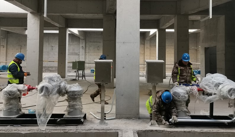 該工程作為太原市最大的地下雨水泵站,工程設(shè)備數(shù)量多、單體體積大、安裝工作體量大、工藝繁雜。為了后期對蓄水池底部的沉渣進(jìn)行沖洗,工程中安裝使用了國際先進(jìn)的水洗門,此設(shè)備與墻體的密閉性要求較高,安裝精度需要控制在±2毫米以內(nèi)。項(xiàng)目部多次與設(shè)計(jì)人員、設(shè)備廠家、技術(shù)指導(dǎo)人員、施工人員進(jìn)行溝通交流,針對施工中的技術(shù)難點(diǎn),確定合理施工方案,廠家技術(shù)人員全程現(xiàn)場觀察、指導(dǎo)。施工人員嚴(yán)謹(jǐn)細(xì)致,確保安裝設(shè)備的平整度和水平度,并根據(jù)廠家技術(shù)人員建議調(diào)整施工細(xì)節(jié),保證了施工的準(zhǔn)確性。同時項(xiàng)目部加強(qiáng)現(xiàn)場監(jiān)護(hù)、安全隱患排查、巡查管理,對檢查中發(fā)現(xiàn)的問題及安全隱患,及時跟蹤,并落實(shí)整改,全力保障施工安全。