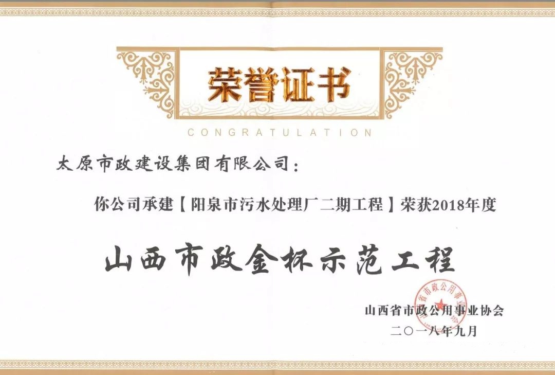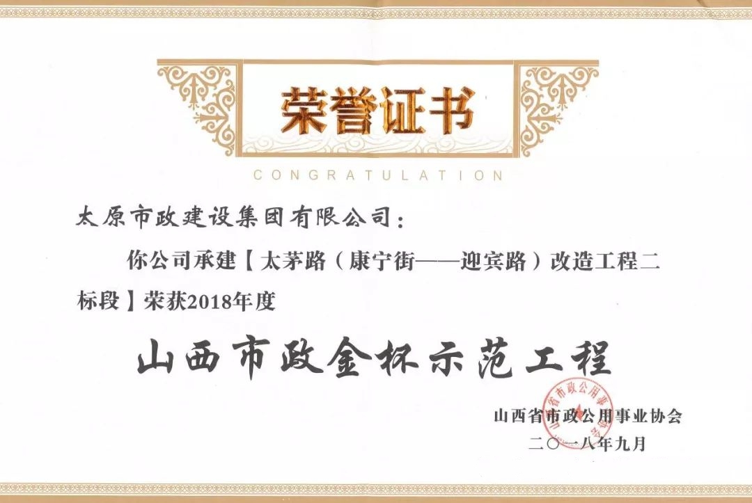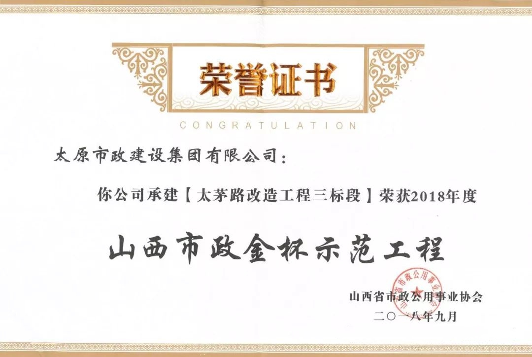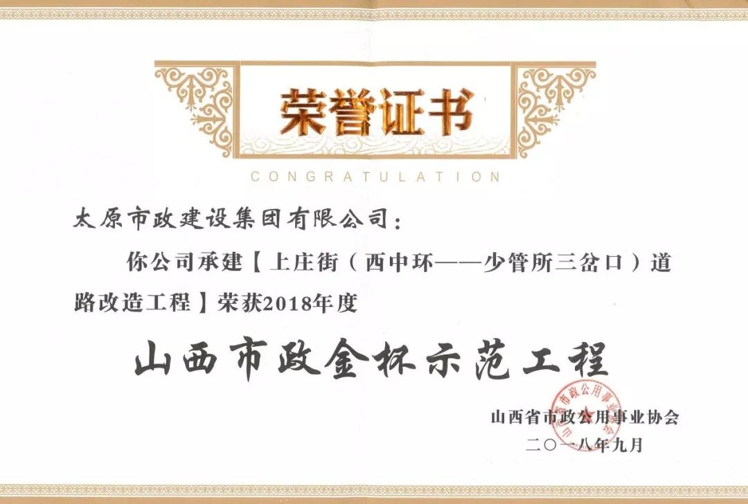 9月20日,太原市政建設集團有限公司承建的太茅路改造工程三標段、陽泉市污水處理廠二期工程、上莊街(西中環(huán)——少管所三岔口)道路改造工程、太茅路(康寧街——迎賓路)改造工程二標段榮獲山西省市政公用事業(yè)協(xié)會頒發(fā)的2018年度“山西市政金杯示范工程”榮譽稱號。
