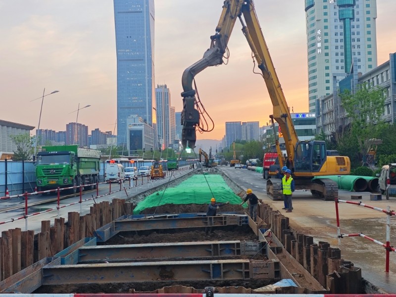 “追求精細(xì)極致,鑄就基坑支護(hù)的穩(wěn)固防線”。項(xiàng)目部將鋼板樁施打質(zhì)量視為確保基坑安全與質(zhì)量的關(guān)鍵環(huán)節(jié),嚴(yán)格執(zhí)行材料準(zhǔn)入制度,所有進(jìn)場鋼板樁均經(jīng)過材質(zhì)證明核查、尺寸精度測量和外觀質(zhì)量檢驗(yàn)三重把關(guān),確保樁身無裂紋、無銹蝕等質(zhì)量缺陷,從源頭上杜絕不合格材料。施工中,施工人員采用全站儀進(jìn)行動態(tài)監(jiān)測,嚴(yán)格控制樁身垂直度偏差在規(guī)定范圍內(nèi),詳細(xì)記錄每根樁的打入深度、貫入度等關(guān)鍵參數(shù)。拔樁階段采用專用施工設(shè)備,按照“先支后拆、分段拔除”的原則有序進(jìn)行,拔樁后出現(xiàn)的孔隙立即灌砂,最大限度減少對周邊土體的擾動,實(shí)現(xiàn)平穩(wěn)施工與環(huán)境保護(hù)的和諧統(tǒng)一。