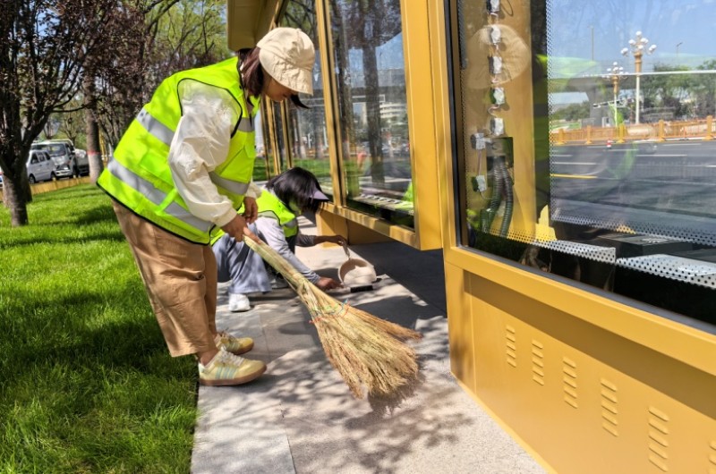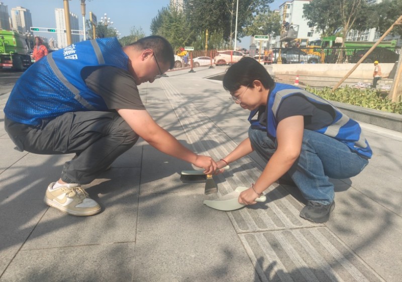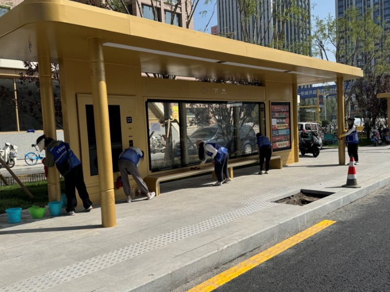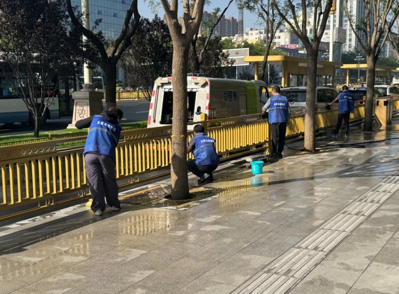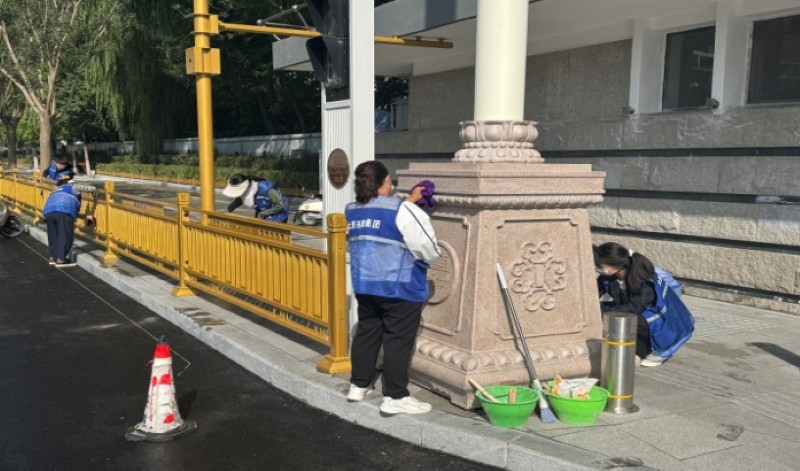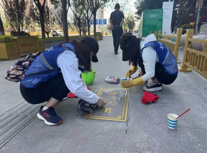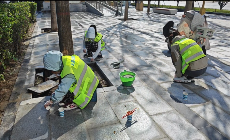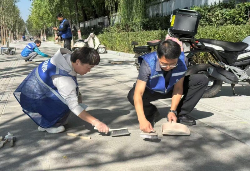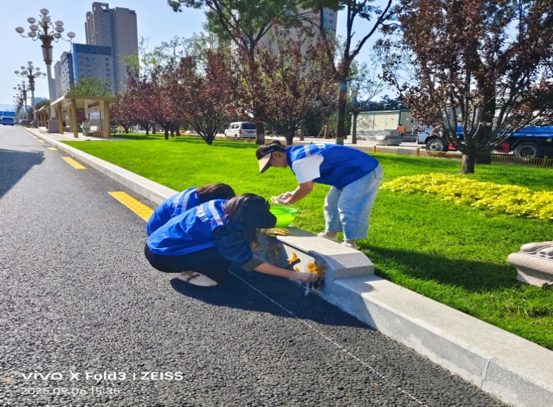 活動自9月4日起為期六天,覆蓋迎澤大街(西段)全線,重點圍繞附屬設(shè)施清潔與道路精細化維護展開。活動中,身著統(tǒng)一藍色“太原市政集團”馬甲的志愿者們,手持長柄擦洗器、水桶、抹布、鏟刀、掃帚等工具,對道路兩側(cè)公交站臺、路燈基地、護欄、照明燈桿等設(shè)施進行系統(tǒng)清理與擦洗;同步推進地磚灌縫精細化維護作業(yè),通過專業(yè)操作,確保每一條裂縫都“嚴絲合縫”,有效提升路面耐用性與通行舒適度,以實際行動為市民出行安全與舒適保駕護航;同時,志愿者專門對道路沿線的石頭字景觀展開描金作業(yè),細刷蘸取金色涂料,一筆一畫精心描摹,成為主干道上一道兼具文化氣息與視覺美感的獨特風(fēng)景。