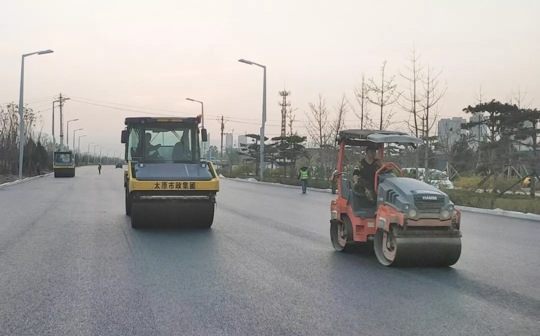 太原市政建設(shè)集團(tuán)有限公司蒙山大街道排工程機(jī)動(dòng)車道與非機(jī)動(dòng)車瀝青上面層已鋪筑完成