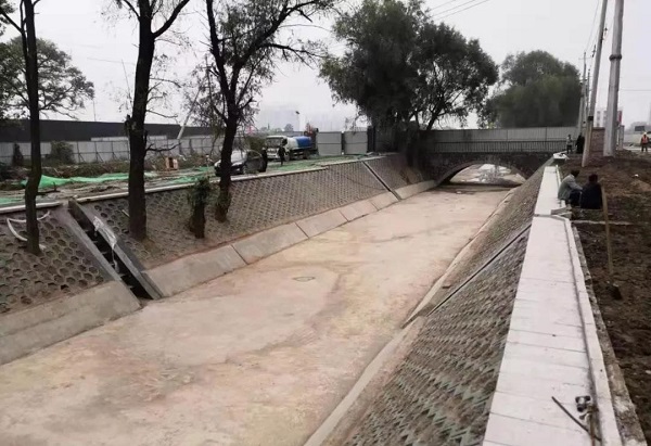 在施工中,由于市內的壓頂磚供應緊張,從市外運送又費時費力,給施工進度造成了一定的影響,為加快施工進度,項目部決定先進行靠背、墊層等環(huán)節(jié)的施工,最后再進行卡邊石的鑲嵌工序,這樣不僅合理安排了施工工序,還大大加快了施工進度。同時,在作業(yè)面狹小的施工段,項目部不等不靠,安排80多名民建隊員同時進行施工作業(yè),采取“人拉肩扛”的作業(yè)方式,全力推進施工進度。僅用時不到100天,項目部就完成了1800米的河道的清淤、底板澆筑、邊坡修整等工作任務,主體工程全部完工,整個渠道“煥然一新”。