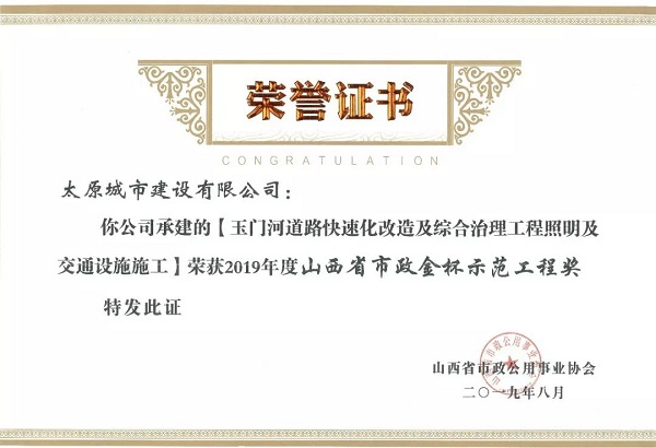 近日,太原城建公司玉門河道路快速化改造及綜合治理工程照明及交通設(shè)施工程榮獲山西省市政公用事業(yè)協(xié)會(huì)頒發(fā)的2019年度“山西省市政金杯示范工程獎(jiǎng)”。太原城建公司靳耕榮獲2019年度“山西市政工程優(yōu)秀項(xiàng)目經(jīng)理”榮譽(yù)稱號。