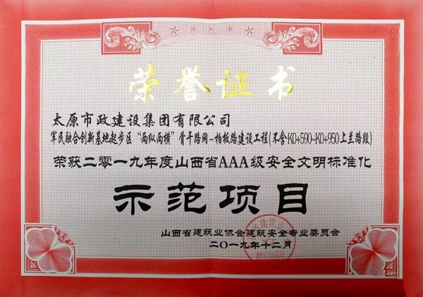 2019年12月25日,由集團(tuán)公司承建的“軍民融合創(chuàng)新基地起步區(qū)‘兩縱兩橫’骨干網(wǎng)絡(luò)—柏板路建設(shè)工程(不含K0+590-K0+950上蘭路段)”榮獲山西省建筑業(yè)協(xié)會(huì)建筑安全專業(yè)委員會(huì)頒發(fā)的“2019年度山西省AAA級(jí)安全文明標(biāo)準(zhǔn)化示范項(xiàng)目”榮譽(yù)稱號(hào)。