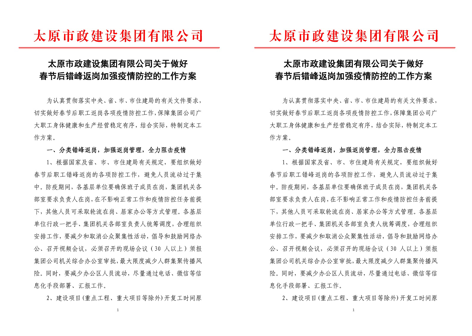 統(tǒng)一指揮,確保領(lǐng)導(dǎo)組織到位。為有效應(yīng)對(duì)新冠肺炎疫情,集團(tuán)公司迅速制定《太原市政建設(shè)集團(tuán)有限公司新型冠狀病毒防控應(yīng)急預(yù)案》,成立集團(tuán)公司新型冠狀病毒感染的肺炎疫情防控工作領(lǐng)導(dǎo)小組,以強(qiáng)有力的領(lǐng)導(dǎo)統(tǒng)籌協(xié)調(diào)推進(jìn)集團(tuán)公司疫情防范和處置工作。同時(shí),集團(tuán)公司制定《太原市政建設(shè)集團(tuán)有限公司關(guān)于做好春節(jié)后錯(cuò)峰返崗加強(qiáng)疫情防控的工作方案》,對(duì)職工復(fù)工前以及返程中個(gè)人防護(hù)、網(wǎng)上辦公等事項(xiàng)作出詳細(xì)安排和明確要求,保障集團(tuán)公司廣大職工身體健康和生產(chǎn)經(jīng)營(yíng)穩(wěn)定有序。