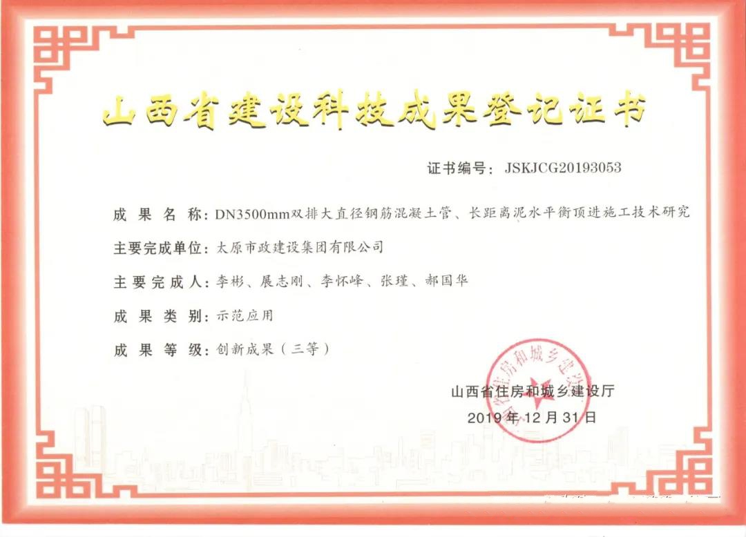 近日,集團公司申報的《DND3500mm雙排大直徑鋼筋混凝土管、長距離泥水平衡頂進施工技術研究》被山西省住房和城鄉(xiāng)建設廳評為創(chuàng)新成果(三等)。