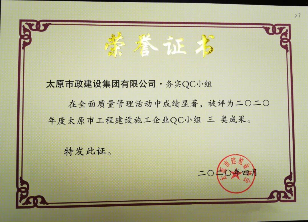 4月10日,集團公司壓實度QC小組的《濕陷性粉土壓實度控制》,被太原市建筑施工協(xié)會評為2020年度太原市工程建設施工企業(yè) QC小組二類成果;集團公司務實QC小組的《提高檢查井旁人行道磚的觀感質(zhì)量》,被太原市建筑施工協(xié)會評為2020年度太原市工程建設施工企業(yè) QC小組三類成果。