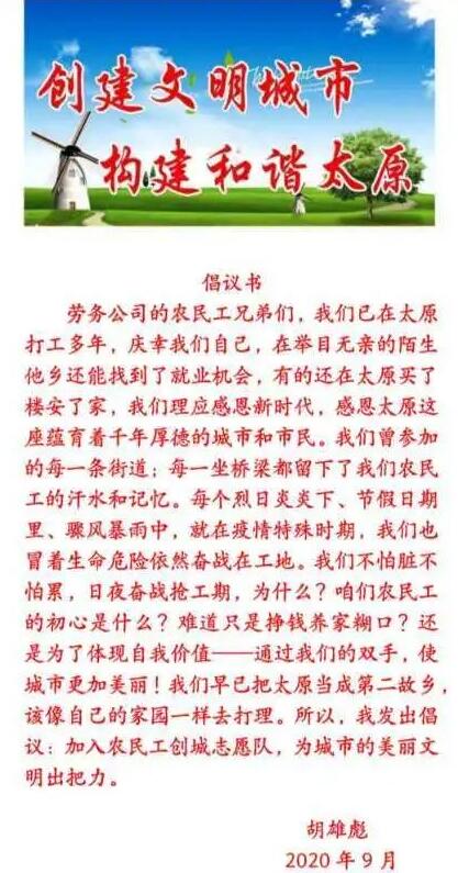 近期,太原廣播電視臺、太原日報、太原晚報等多家新聞媒體對胡雄彪和他的農(nóng)民工志愿服務(wù)隊進行了多次報道,集團公司也積極鼓勵全體農(nóng)民工和職工都積極行動起來,加入到創(chuàng)城活動中。