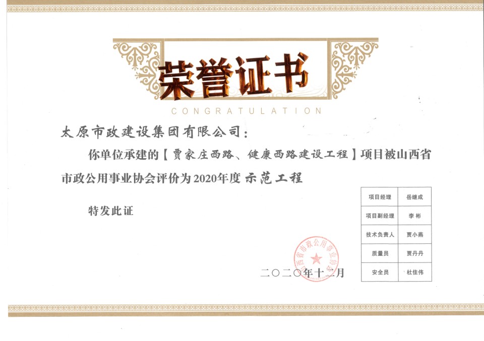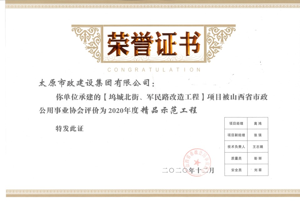 12月26日,集團(tuán)公司被太原市勞動(dòng)競(jìng)賽委員會(huì)授予“集體三等功”榮譽(yù)稱號(hào)。集團(tuán)公司承建的太原市軌道交通2號(hào)線一期工程站點(diǎn)道路恢復(fù)工程、車站出入口廣場(chǎng)地面部分建筑施工工程,是太原市地鐵2號(hào)線的重要組成部分。集團(tuán)公司全體參建人員凝心聚力、攻堅(jiān)克難,圓滿完成了23個(gè)地鐵站點(diǎn)共計(jì)95個(gè)出入口小廣場(chǎng)鋪裝任務(wù),以及南內(nèi)環(huán)以南共計(jì)15公里的路面恢復(fù)及綜合整治工作,進(jìn)一步完善了太原市地鐵2號(hào)線的整體建設(shè),改善了周邊道路的通行情況,為太原市地鐵2號(hào)線通車運(yùn)營(yíng)奠定了堅(jiān)實(shí)的基礎(chǔ)。