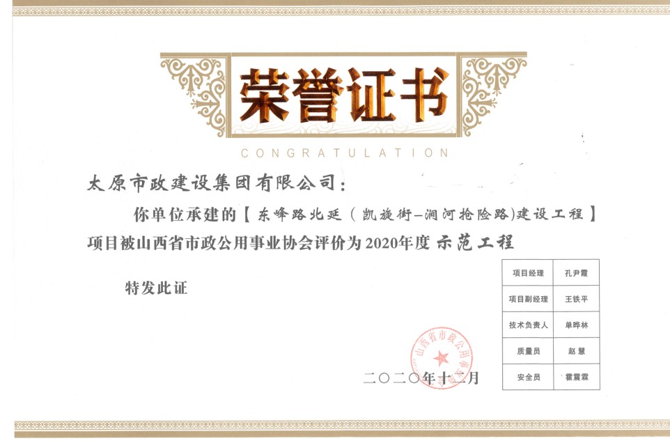 近日,集團(tuán)公司承建的塢城北街、軍民路改造工程被山西省市政公用事業(yè)協(xié)會(huì)評(píng)為“2020年度精品示范工程”,東峰路北延(凱旋街—澗河搶險(xiǎn)路)建設(shè)工程,賈家莊西路、健康西路建設(shè)工程被山西省市政公用事業(yè)協(xié)會(huì)評(píng)為“2020年度示范工程”。同時(shí),高鴻、孔尹霞在2020年度山西省市政公用事業(yè)協(xié)會(huì)市政工程項(xiàng)目經(jīng)理評(píng)價(jià)活動(dòng)中被評(píng)為“優(yōu)秀項(xiàng)目經(jīng)理”。