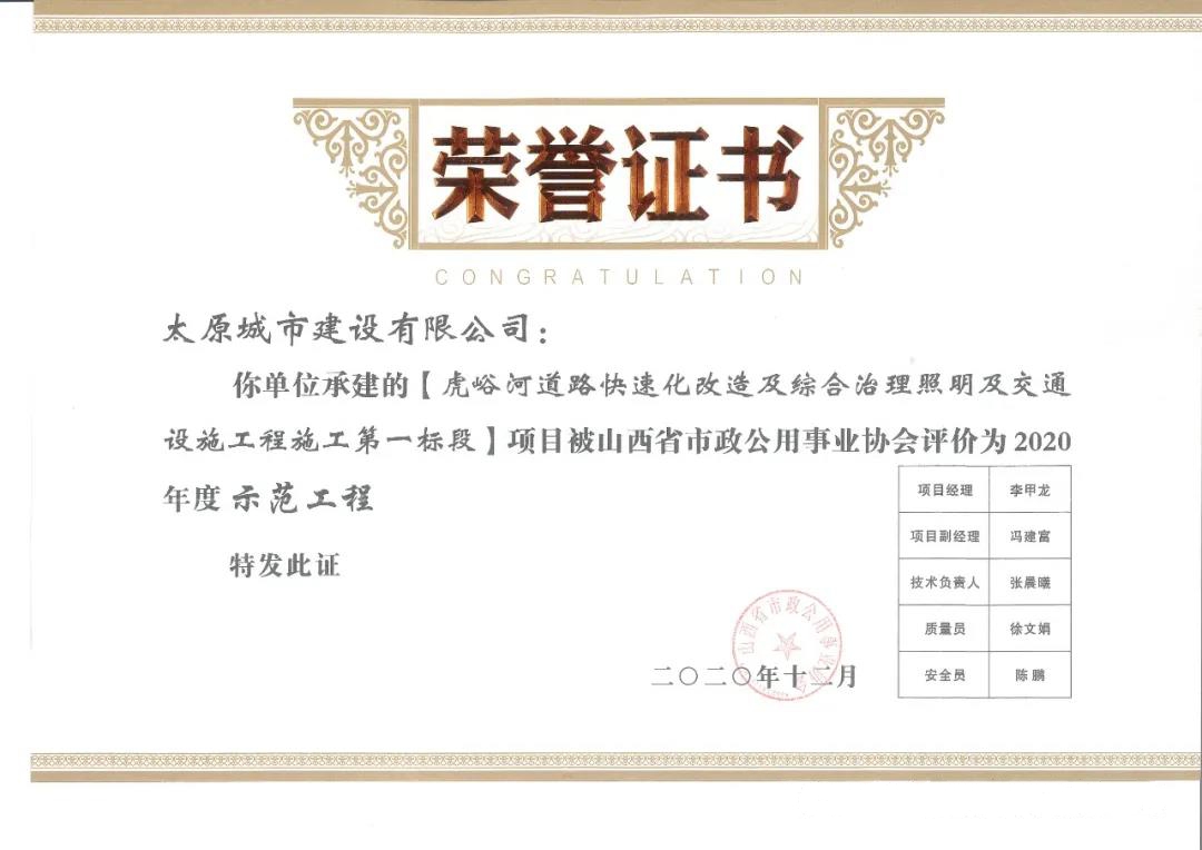 近日,太原城建公司承建的虎峪河道路快速化改造及綜合治理照明及交通設(shè)施工程施工一標(biāo)段被山西省市政公用事業(yè)協(xié)會(huì)評(píng)為“2020年度示范工程”。李甲龍?jiān)?020年度山西省市政公用事業(yè)協(xié)會(huì)市政工程項(xiàng)目經(jīng)理評(píng)價(jià)活動(dòng)中被評(píng)為“優(yōu)秀項(xiàng)目經(jīng)理”。