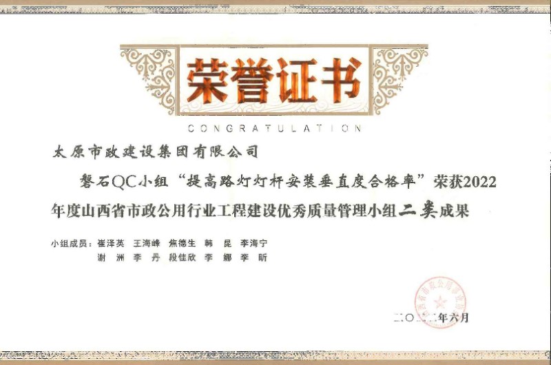 2022年度山西省市政公用行業(yè)工程建設(shè)優(yōu)秀質(zhì)量管理小組二類成果_磐石QC小組“提高路燈燈桿安裝垂直度合格率”